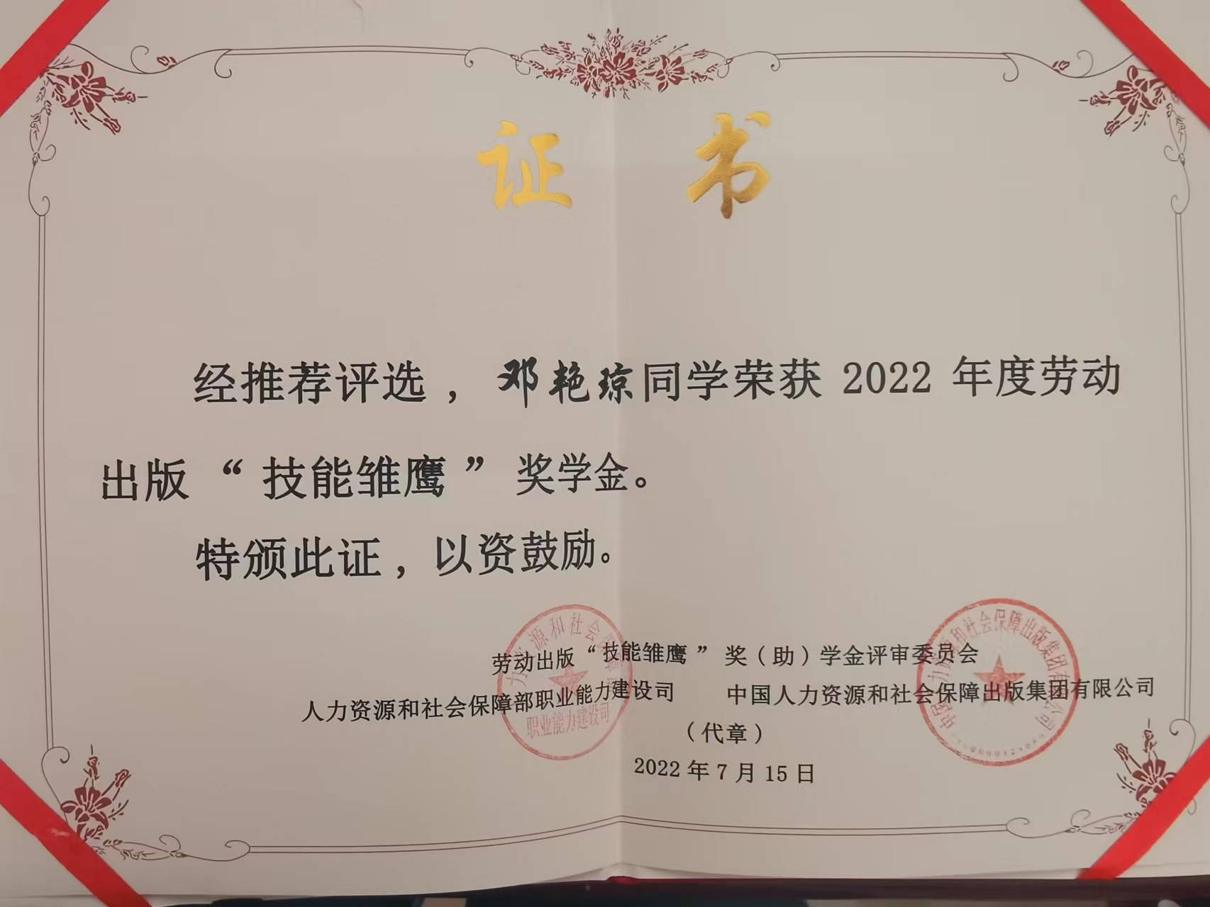 祝贺!我院经济管理系邓艳琼同学荣获2022年度劳动出版“技能雏鹰”奖学金