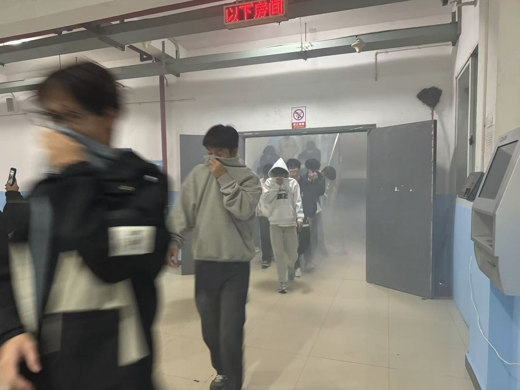 随着警报声的突然响起,消防疏散演练正式拉开帷幕。师生们迅速作出反应,用手帕或者衣袖捂住口鼻,弯腰低姿态前行,按照预定的疏散路线有序撤离。学生们也没有丝毫慌乱,互相照应着,快速且有序地向安全出口疏散。
