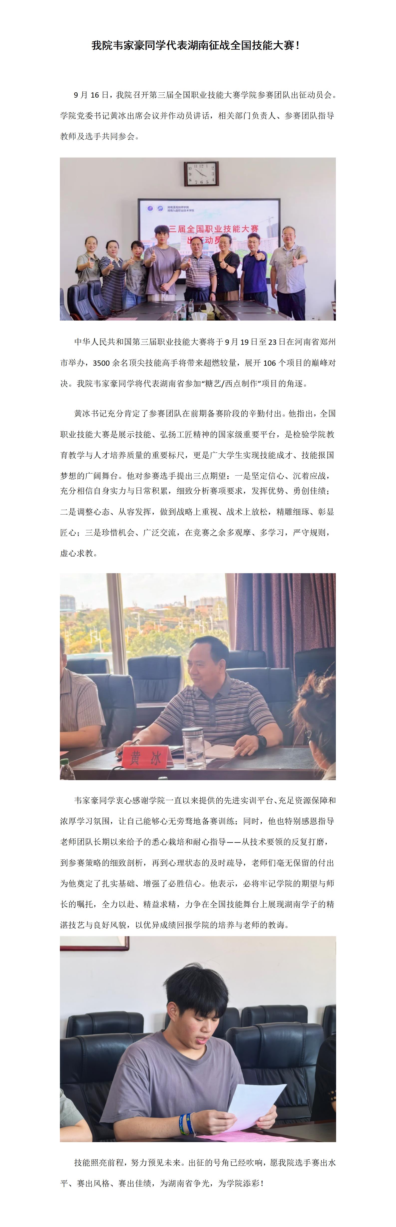 我院韦家豪同学代表湖南征战全国技能大赛!